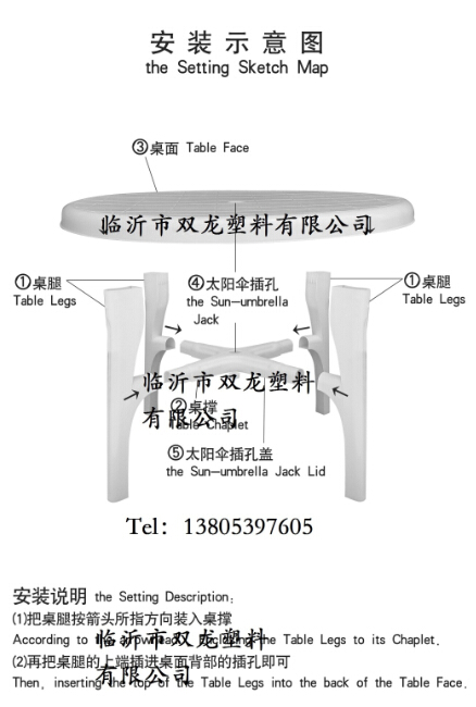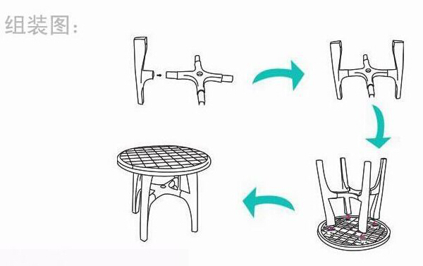 關(guān)于拼裝通過下面的示意圖可以看出基本的步驟。實(shí)際操作中首先是桌腿與桌撐的組合,通過預(yù)留的卡槽,首先手持桌撐將桌腿卡入,一次重復(fù)四次將四條桌腿安裝完畢。然后將桌面反向放置于平整地面,將組合好的桌腿與桌撐,對準(zhǔn)卡槽,推入四條桌腿,這樣一個(gè)完整的塑料桌子就組裝好了。拆卸過程同樣簡單,指示把上述流程反向操作即可。